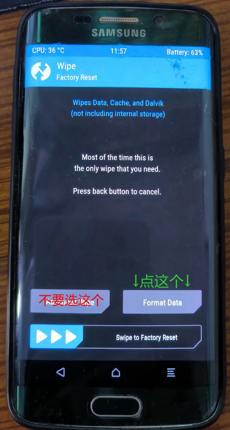 • 进入 Wipe 菜单,选择 Format Data,并注意不要选择 Advanced Wipe,输入 yes 以确认清除系统数据