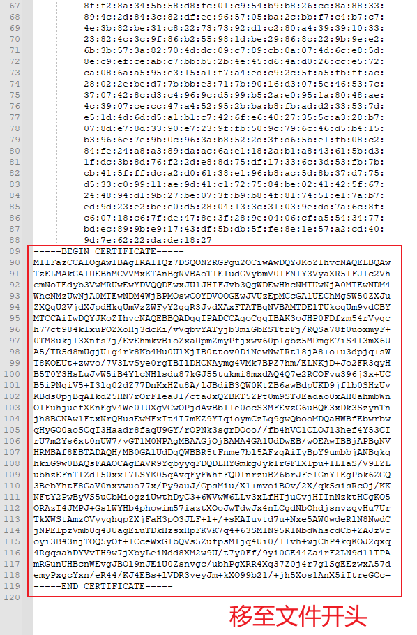 找到底部的 Base64 编码(包含从 —–BEGIN CERTIFICATE—– 到 —–END CERTIFICATE—– 的部分)