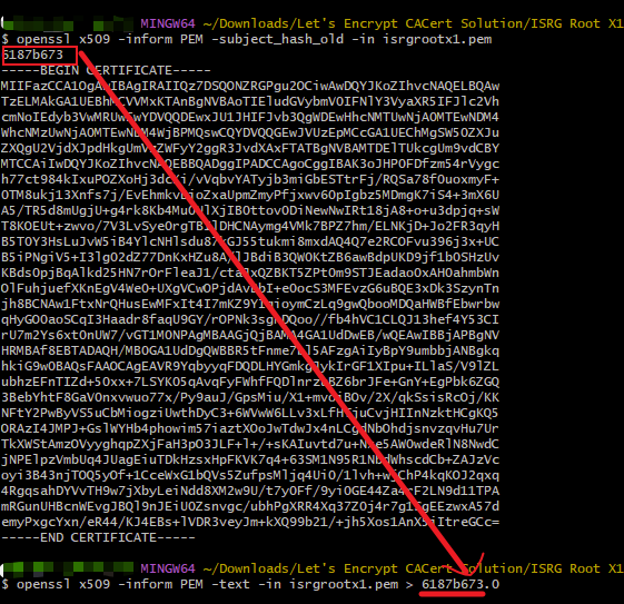 openssl x509 -inform PEM -subject_hash_old -in isrgrootx1.pem